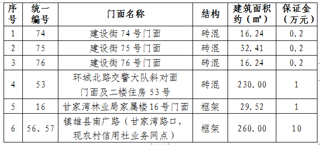 1、拍租6個門面3年期使用權(quán),詳見下表: